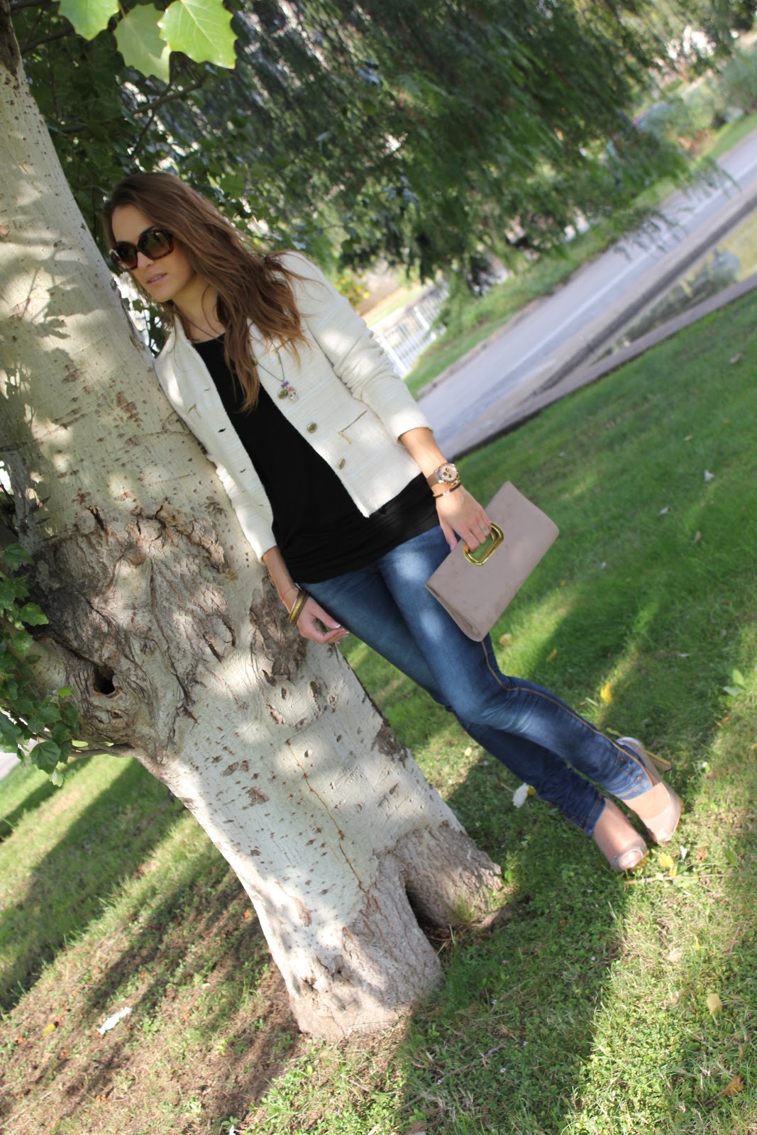 Camiseta, chaqueta de tweed y peep toes de ZARA, jeaggings de STR, clutch PRIMADONNA, collar calavera BETSEY JHONSON, reloj ROLEX, y pulseras de TOUS, STR y ROCA JOIERS.