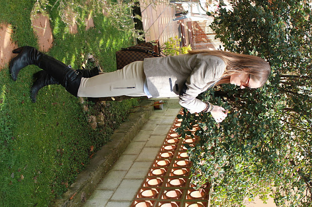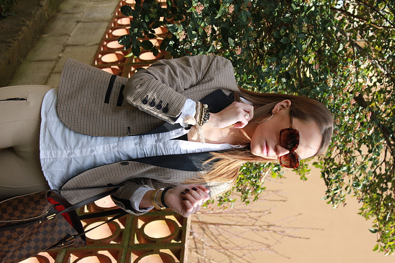 Leggins y camisa blanca de ZARA, americana de STRADIVARIUS, botas de piel mosqueteras de MARLO'S, bolso LV, gafas de sol D&G, pulseras TOUS, LA SEÑORITA y STR, y reloj CASIO.