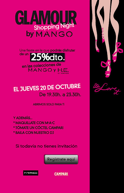 Hoy se celebra en 31 ciudades de España y en la tienda on line, la Glamour Shopping Night by Mango. Desde las 19.30h y hasta las 23.30h, las tiendas Mango acogerán la fiesta de las compras: 25% de descuento en todas las prendas, sesiones de maquillaje de la mano de MAC, cócteles Campari y un dj para animar la velada.