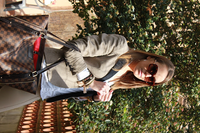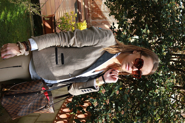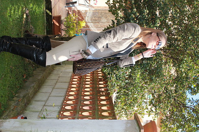 Leggins y camisa blanca de ZARA, americana de STRADIVARIUS, botas de piel mosqueteras de MARLO'S, bolso LV, gafas de sol D&G, pulseras TOUS, LA SEÑORITA y STR, y reloj CASIO.