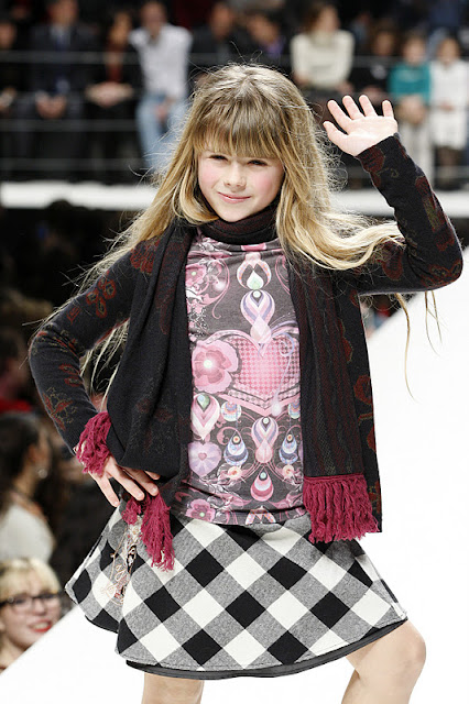 En la línea infantil, Custo sí apuesta de nuevo por la vitalidad que transmiten sus estampados de colores. Y la verdad es que, personalmente, me encanta que los niños lleven looks divertidos y coloridos, pero "copiando" la estética de las colecciones para adultos. Y en este caso, Custo apuesta por diseños glitter, de pelo, vestidos vintage, faldas de cuadros escoceses (un must del próximo otoño/invierno)...